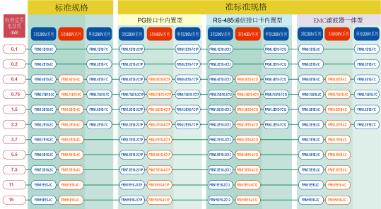 ●将PG接口卡内置型、RS485通讯内置型及EMC滤波器一体型系列化。
