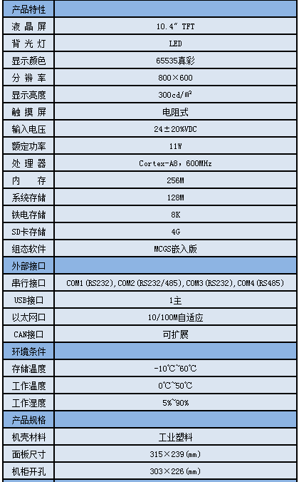 TPC1162Hi,是一套以先进的Cortex-A8 CPU为核心(主频600MHz)的高性能嵌入式一体化触摸屏。该产品设计采用了10.4英寸高亮度TFT液晶显示屏(分辨率800×600),四线电阻式触摸屏(分辨率4096×4096)。同时还预装了MCGS嵌入式组态软件(运行版),具备强大的图像显示和数据处理功能。