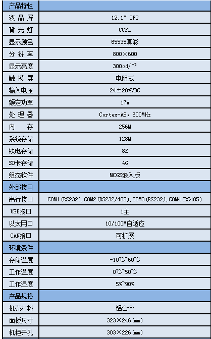 TPC1262Hi,是一套以先进的Cortex-A8 CPU为核心(主频600MHz)的高性能嵌入式一体化触摸屏。该产品设计采用了12.1英寸高亮度TFT液晶显示屏(分辨率800×600),四线电阻式触摸屏(分辨率4096×4096),以及具有良好的电磁屏蔽性,美观坚固的铝合金结构。同时还预装了MCGS嵌入式组态软件(运行版),具备强大的图像显示和数据处理。